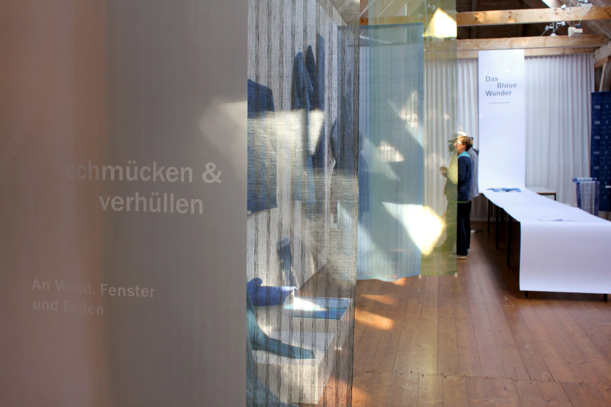 Das Gestaltungskonzept spielt mit dem Blick hinter die Kulissen: Hinter transluzenten Papierbahnen präsentieren sich über 100 vielfältige Webstücke in facettenreichen Blautönen in Kategorien wie etwa „Am Körper“ oder „Zu Tisch”. Die Gestaltung lässt die blauen Webstücke als einzigartige Exponate wirken. Gleichzeitig wird ein anderer musealer Prozess vor die Kulissen geholt: Das Inventarisieren der Objekte findet als offener Prozess während der Ausstellung statt. Der Katalog füllt sich nach und nach mit den Abbildungen der Objekte und dem kollektiven Wissen der Weber*innen sowie Besucher*innen.