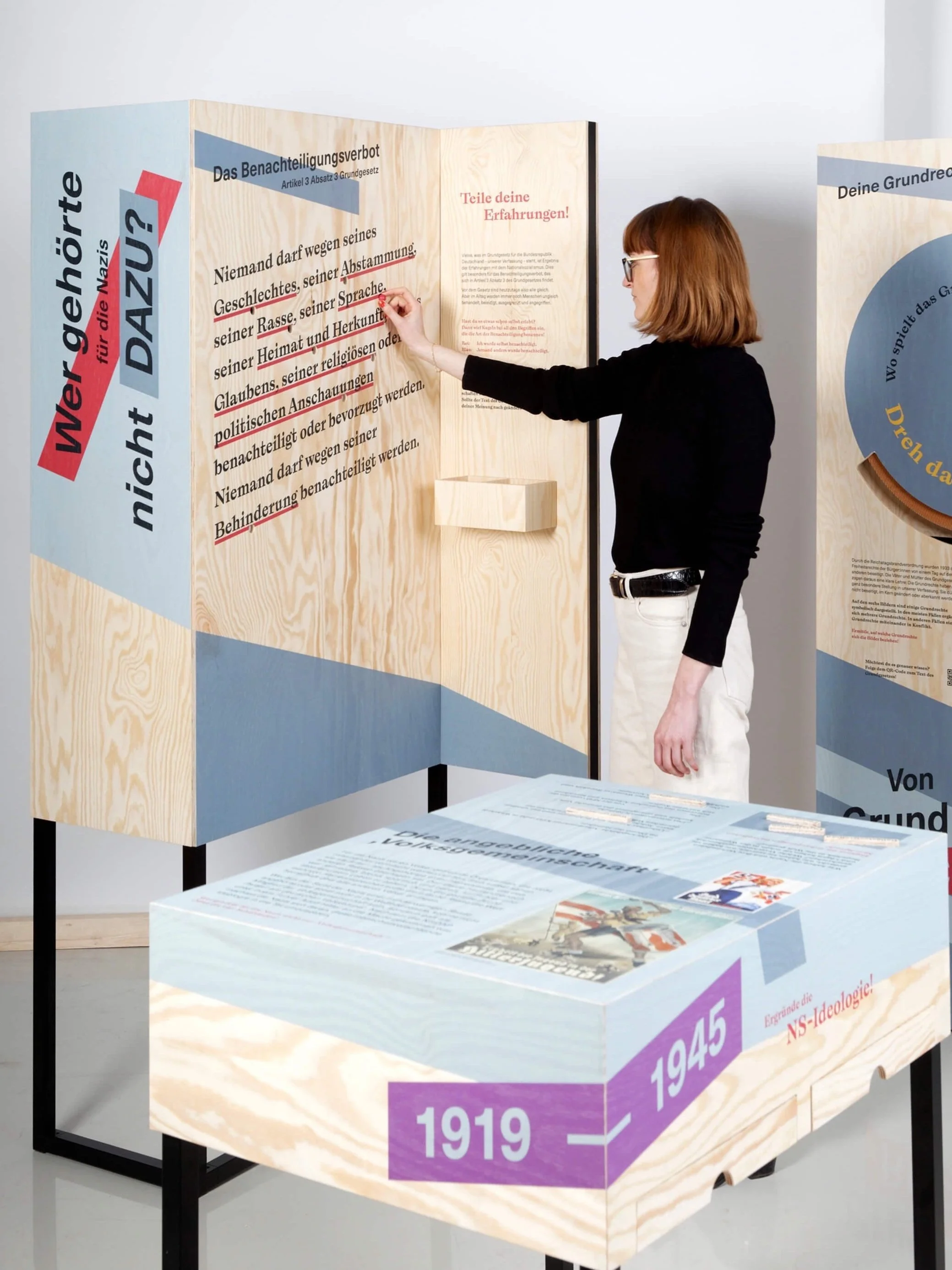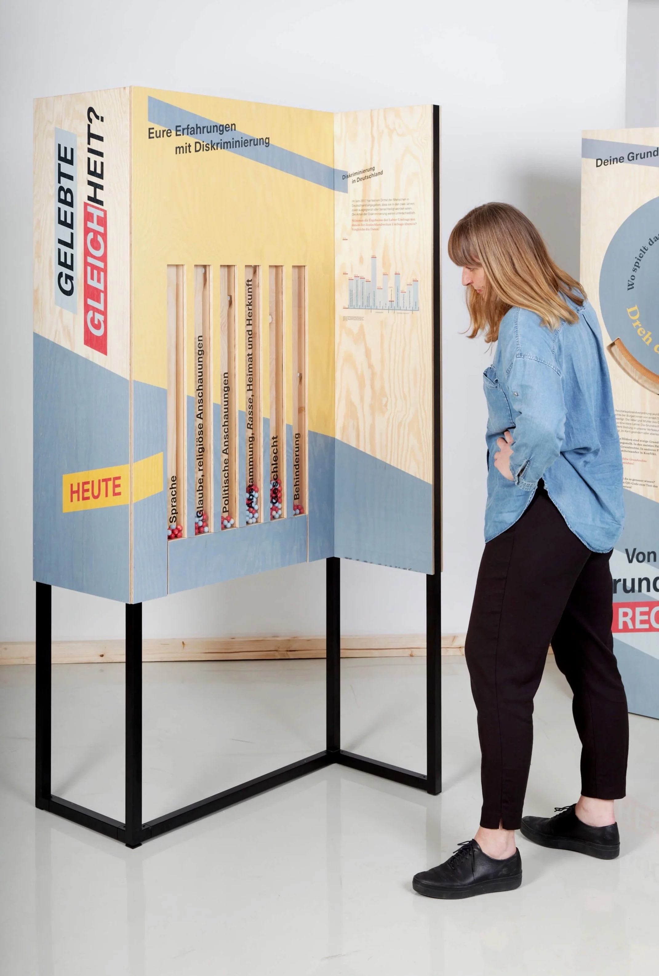Die Gestaltung der Stationen lädt die Besucher:innen dazu ein, Inhalte zu entdecken, sich miteinander auszutauschen und zu Wertfragen Stellung zu nehmen.