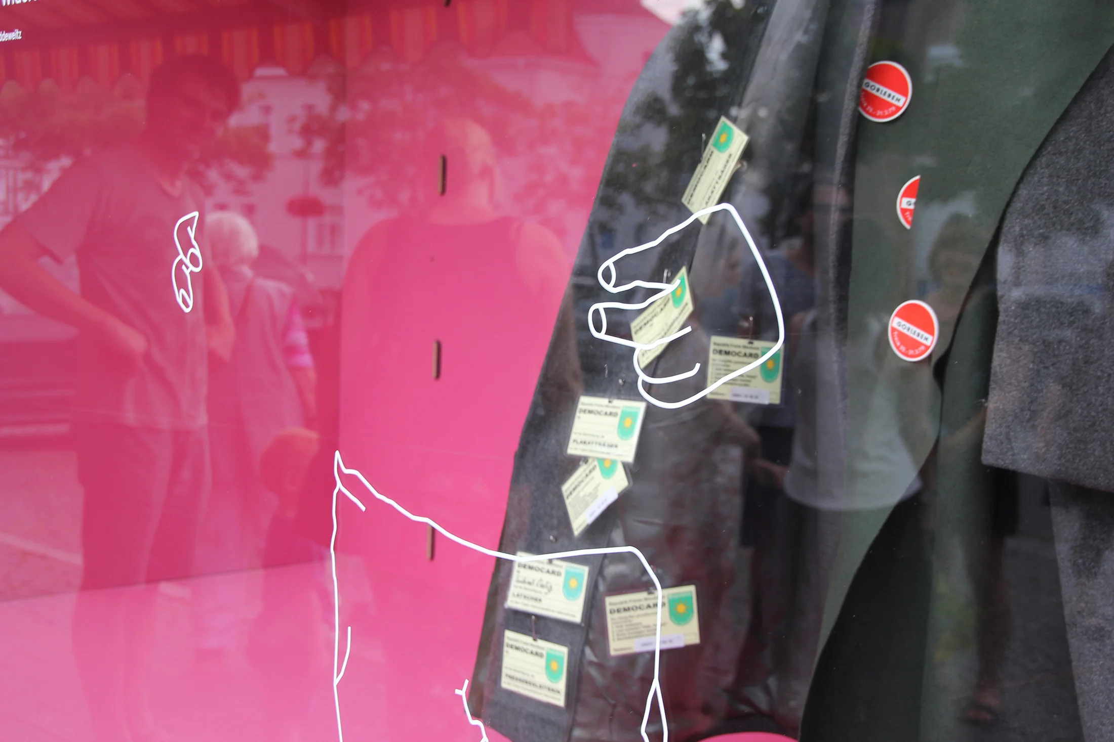 „Mit dem Mantel bin ich immer an den Polizisten vorbeigelaufen und hab ihn dabei geöffnet. Das war wie bei einer Piepshow oder auf dem Schwarzmarkt. Kleine Democard gefällig? Widerstand muss Spaß machen! Das war die Devise dabei.”